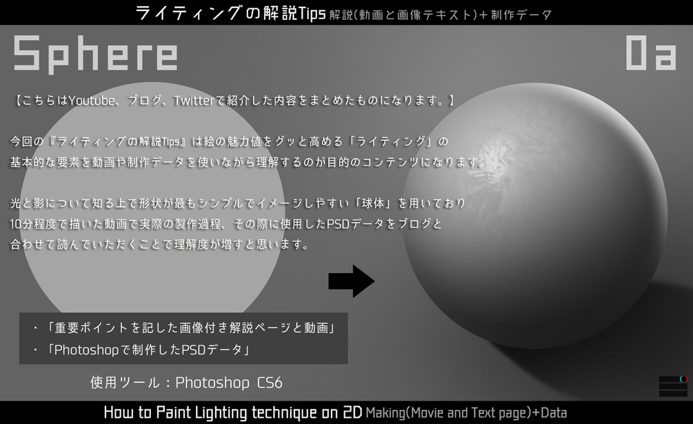 It uses the "sphere" which is the simplest shape and easy to imagine in knowing about light and shadow, and the content becomes "movie" + "PSD data" + "bonus".